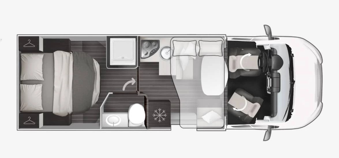 En su interior, destaca por su cama central tipo isla, un amplio garaje, cocina equipada con frigorífico de 137 litros y un baño con ducha integrada. Una opción perfecta para quienes quieren recorrer la carretera con total comodidad y estilo.