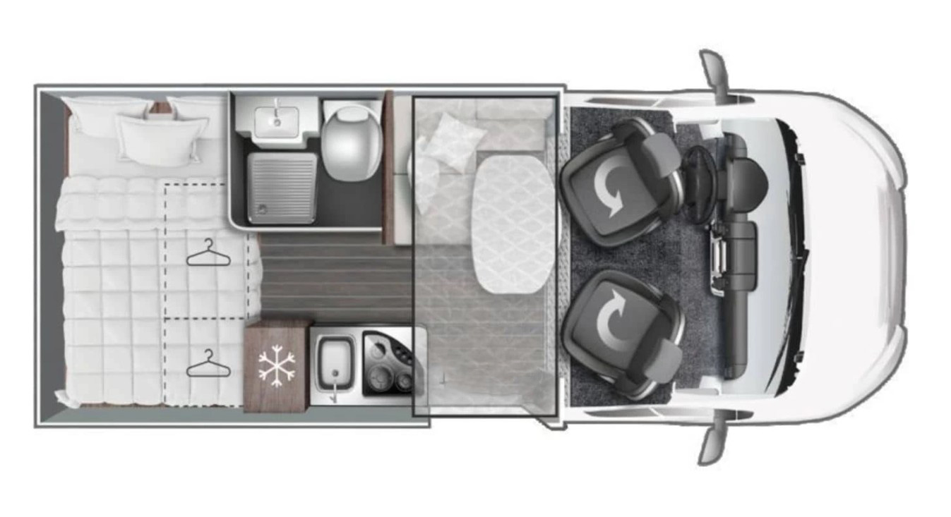 Su diseño interior incluye una cama transversal, amplio garaje, cocina con frigorífico de 137 litros y baño con ducha integrada. Ideal para quienes buscan aventuras en carretera con máximo confort.
